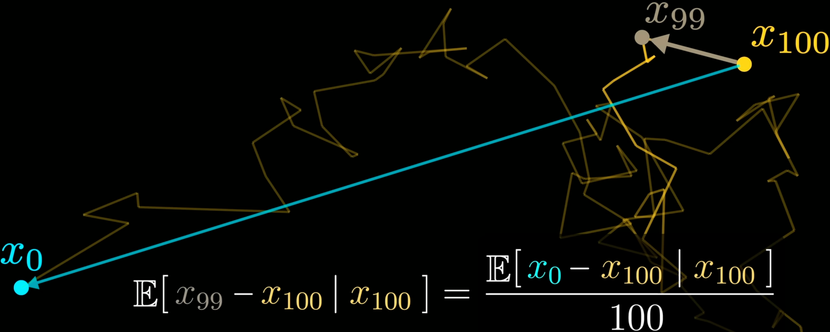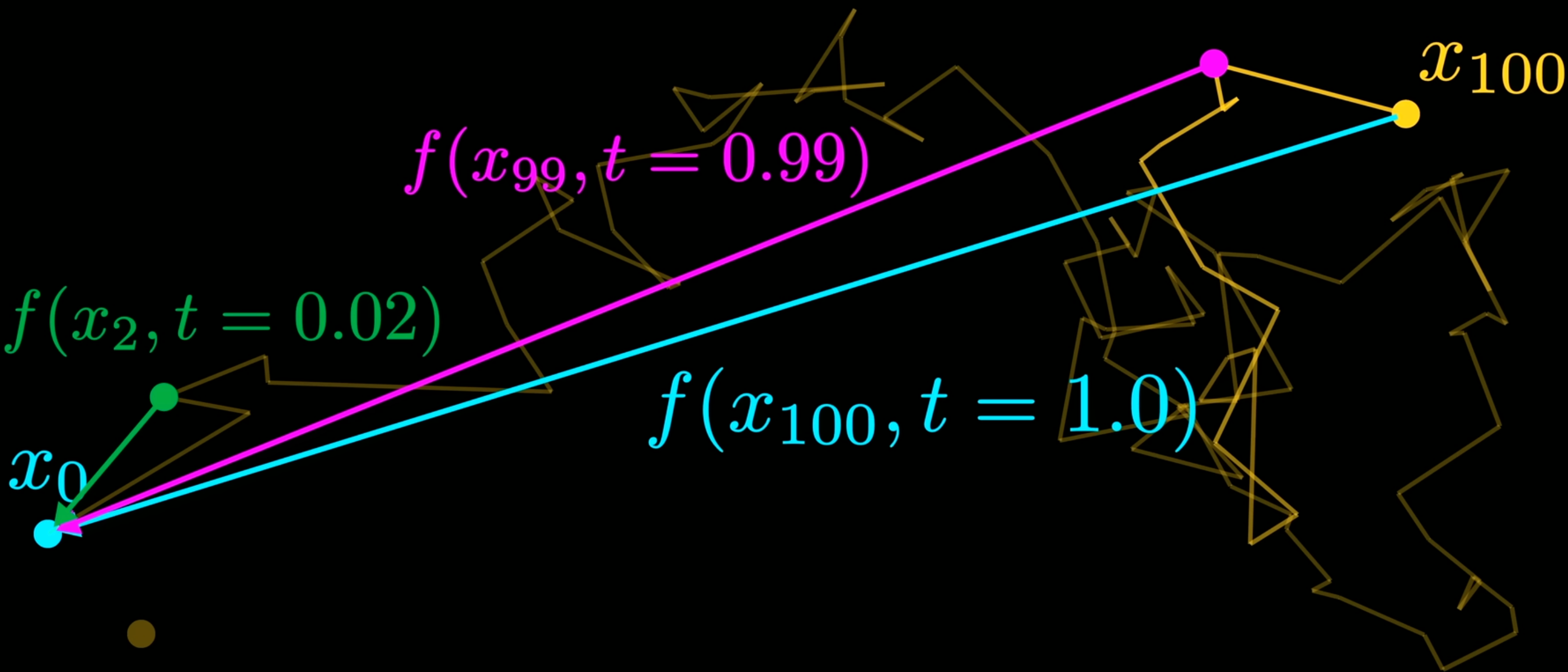 Figure 2: 即使 Brownian Motion 是随机的, 点的移动是有逐步向外扩散的趋势的, 相当于逆过程有向中心靠拢的趋势, 而神经网络大概率可以学到这种趋势