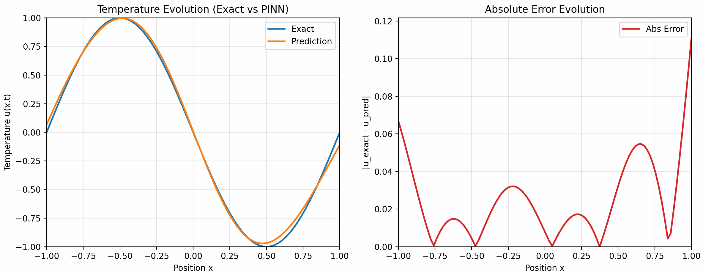 也就是说, 在任意位置和时间 \((x,t)\), 我们都能解析地算出温度, 我们会用这个结果与 PINN 预测的结果进行对比: