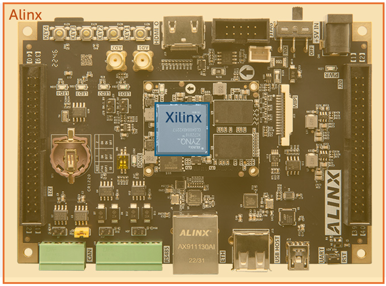 - 开发板制造商: 从芯片设计制造商处采购芯片, 并设计供电电路、时钟电路、将方形黑色的芯片底部的引脚引出接入各种物理接口、设计 PCB 等, 最终生产出开发板. E.g., Alinx, 正点原子, Digilent.